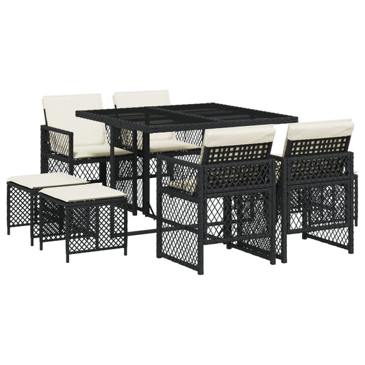 Set da Pranzo da Giardino 9 pz con Cuscini Nero in Polyrattan
