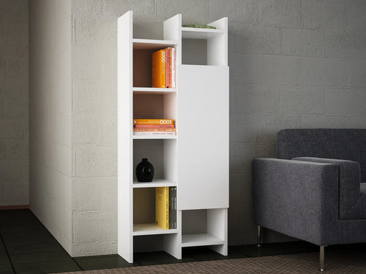 Pouf aus weißem Polyesterstoff mit Struktur aus Buchenholz.