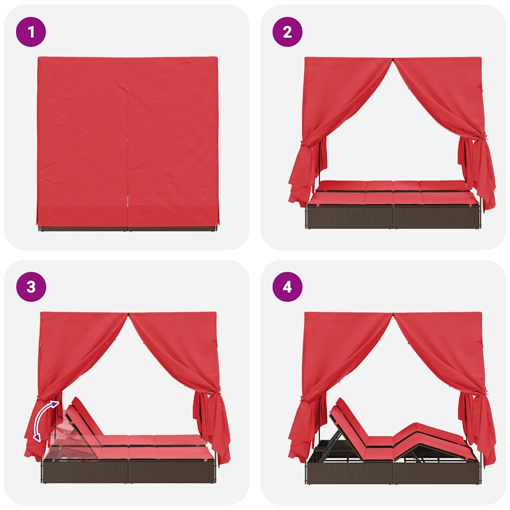 Questo lettino da sole doppio per esterni unisce stile e praticità, ideale per rimanere comodi in giardino o in terrazza. È fatto di polyrattan che gli dà un tocco moderno, e ha una resistente struttura in acciaio per un’ottima durata. Le linee morbide e l’aspetto contemporaneo fanno di questo lettino una fantastica aggiunta al tuo spazio esterno. Grazie al tetto e alle tende, puoi creare il tuo angolo di relax all'aperto. È spazioso per due persone, perfetto per coppie o amici. Che tu voglia goderti il sole o stare al fresco, questo lettino è adatto a qualsiasi situazione.