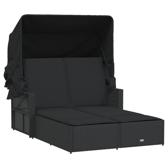 Lettino Prendisole Doppio Baldacchino e Cuscini Nero Polyrattan