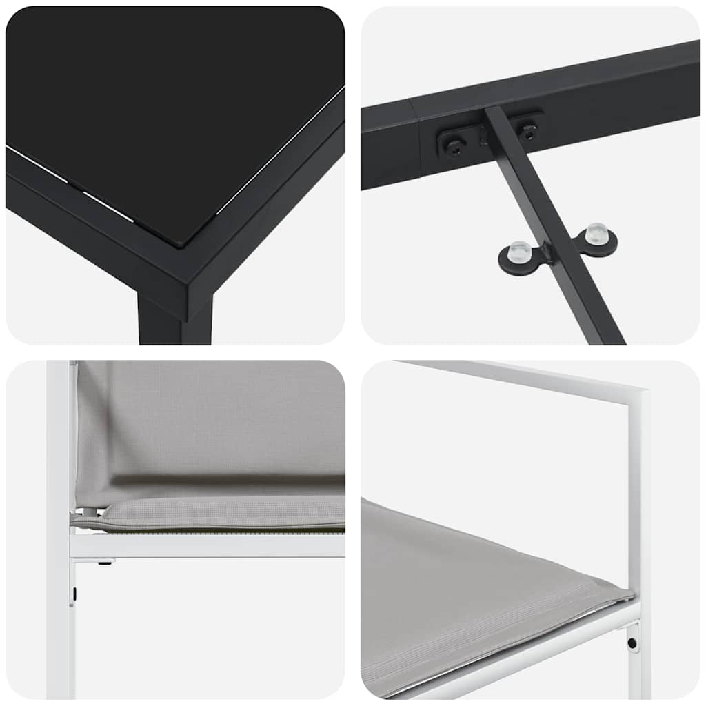 - Materiali: Il set da pranzo è realizzato con tessuto Textilene, che asciuga rapidamente e dura a lungo. Completato da vetro temperato, offre una superficie di pranzo elegante e senza cuciture. I telai in acciaio verniciato a polvere garantiscono stabilità e resistenza agli agenti atmosferici, perfetto per ogni riunione.
