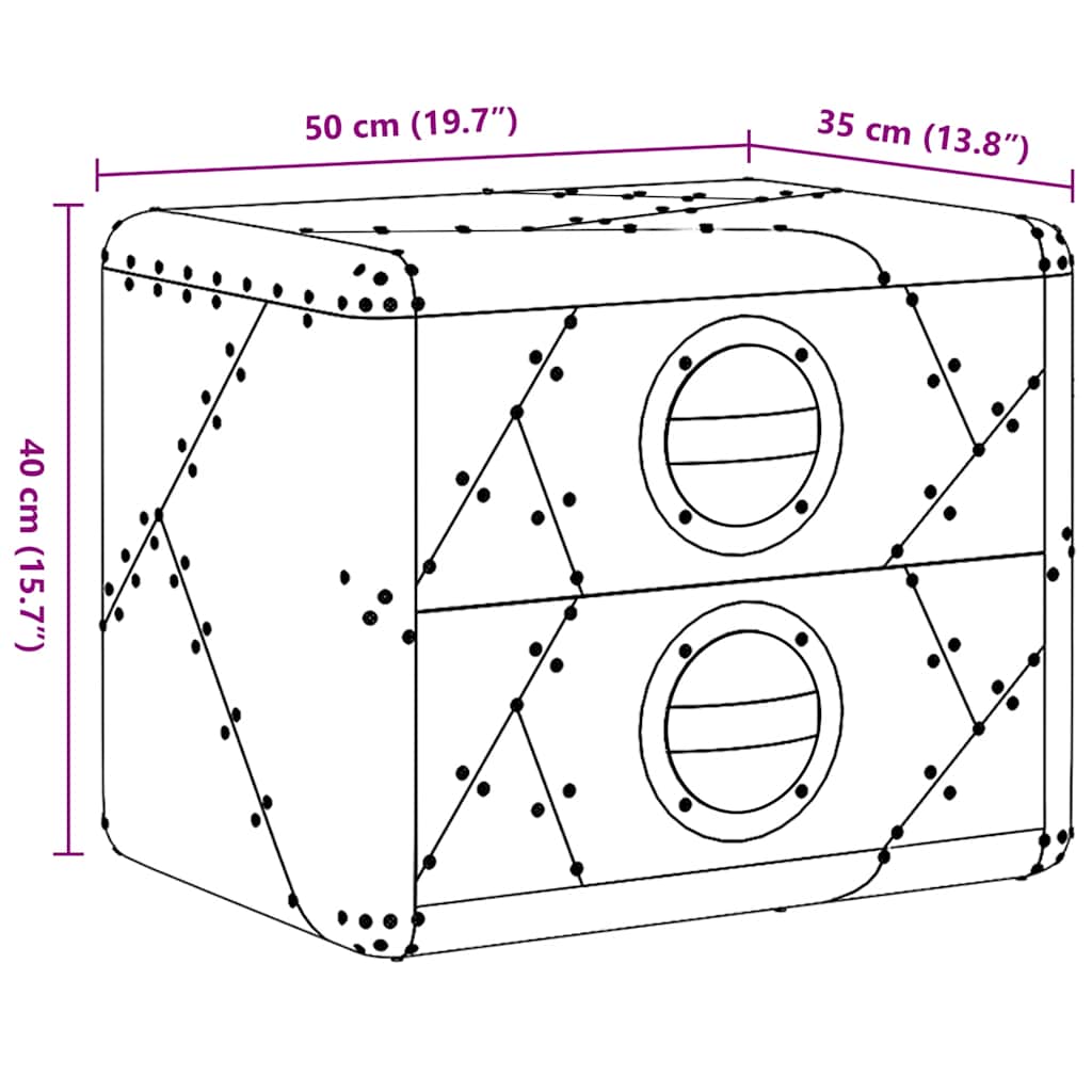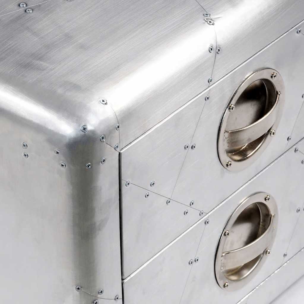 Questo tavolino in stile aereo è realizzato in legno massello e la sua superficie è rivestita con un patchwork di pannelli in alluminio lucido, accentuati da viti in acciaio a vista, che lo rendono estremamente resistente. I bordi lisci e le maniglie dei cassetti retrò conferiscono al tavolino da aviatore un aspetto unico.