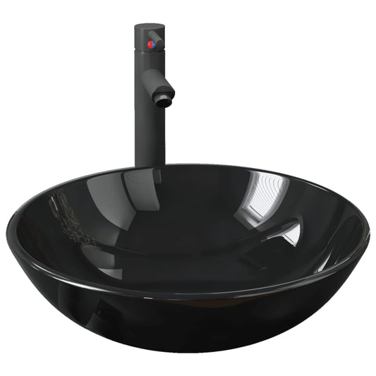 Lavandino Bagno con Rubinetto e Piletta in Vetro Temperato Nero