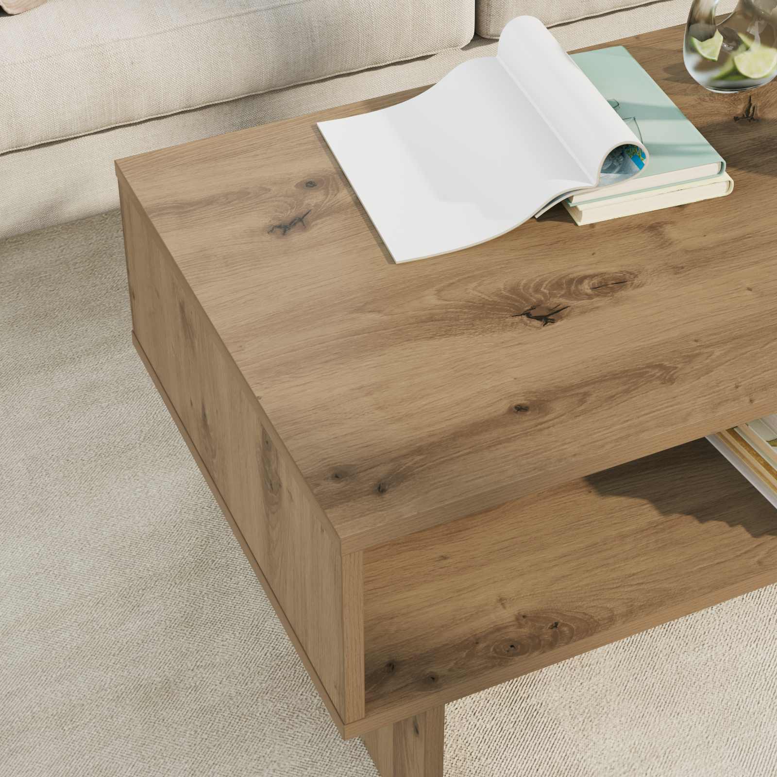 - Ripiani Integrati - Con ripiani sottostanti, il tavolino offre ampio spazio per riviste e telecomandi. Questi ripiani in legno ingegnerizzato mantengono l'aspetto uniforme del tavolo e forniscono praticità senza compromettere lo stile.