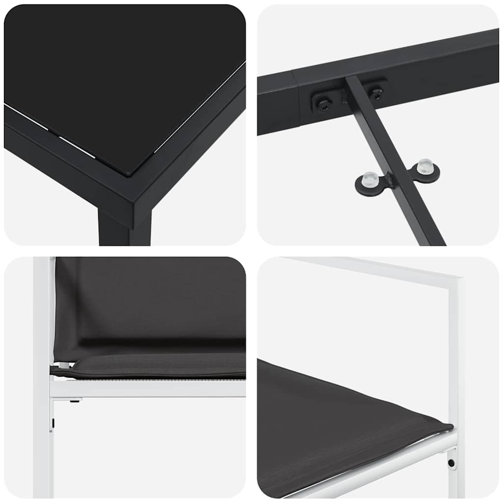 - Materiali: Il set da pranzo è realizzato con tessuto Textilene, che asciuga rapidamente e dura a lungo. Completato da vetro temperato, offre una superficie di pranzo elegante e senza cuciture. I telai in acciaio verniciato a polvere garantiscono stabilità e resistenza agli agenti atmosferici, perfetto per ogni riunione.